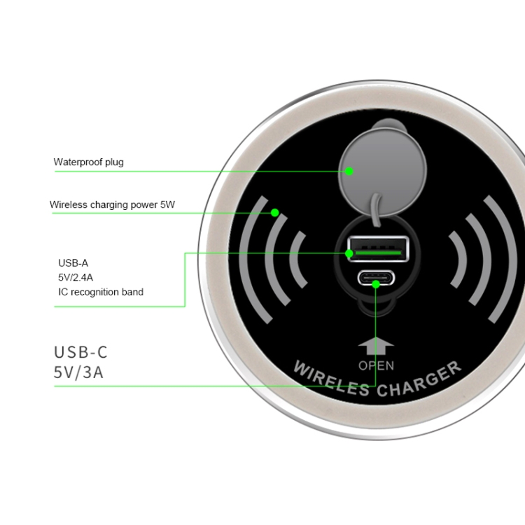 3. Inngang: USB-A: 5V / 2.4A, USB-C: 5V / 3A (15W)